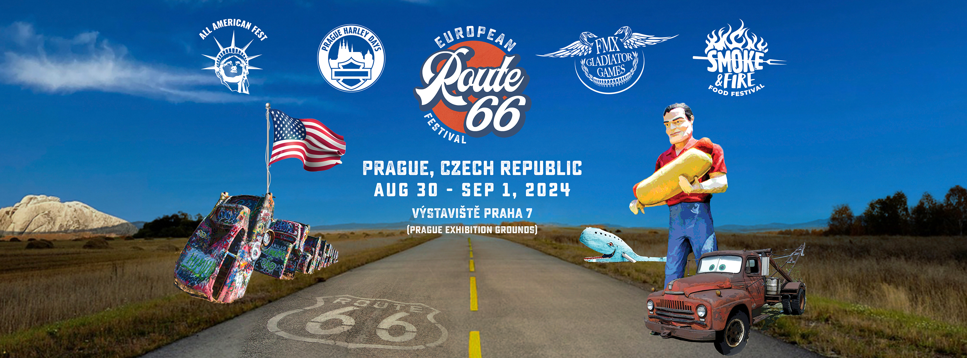 Takže to je ta skvělá zpráva: Letošní ročník All American Festivalu se koná ve dnech 30. srpna – 1. září na pražském Výstavišti a jeho součástí je kromě Prague Harley Days, Smoke & Fire Food Festivalu a FMX Gladiator Games také Evropský festival Route 66! A pozor: ROUTE 66 se letos stává letos též hlavním tématem a tváří celého festivalu!