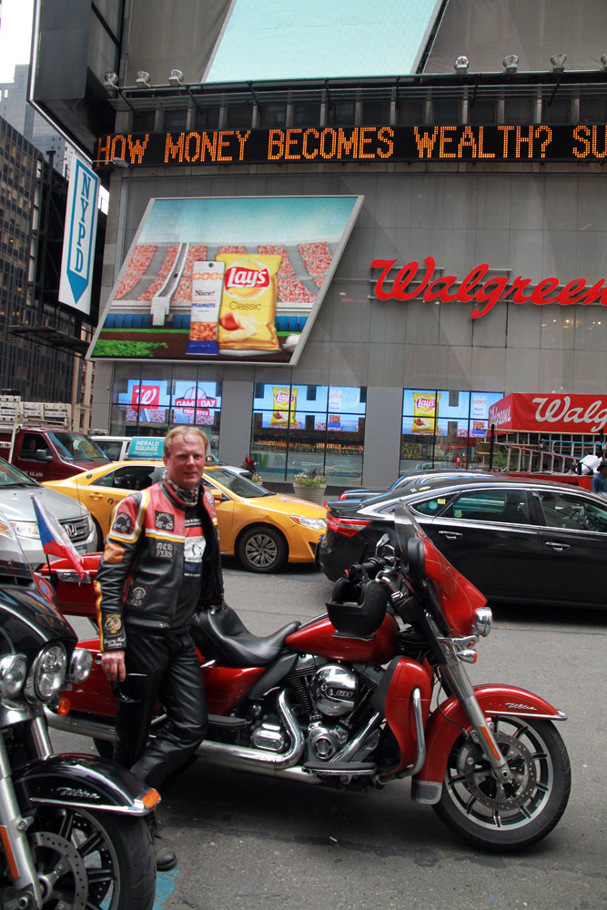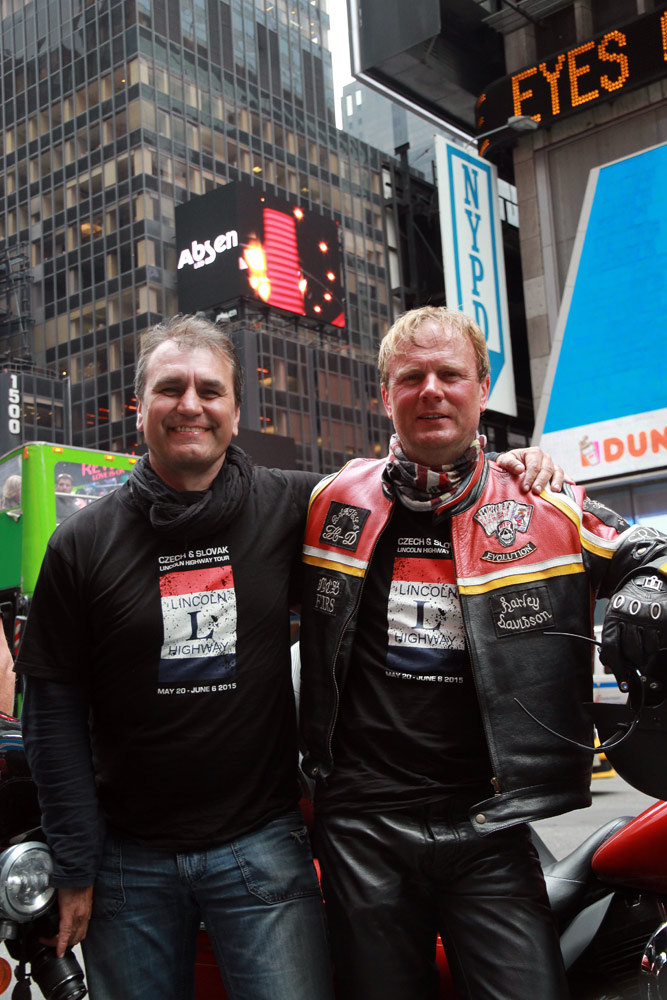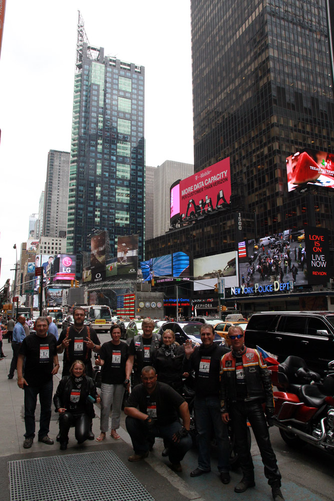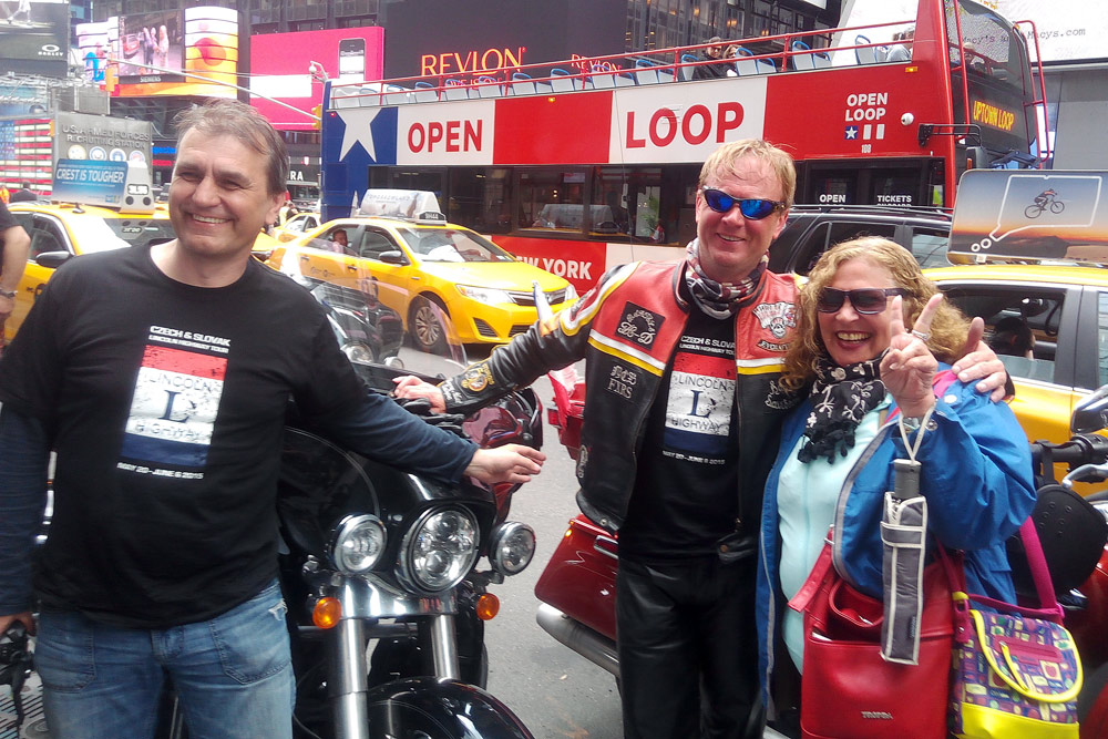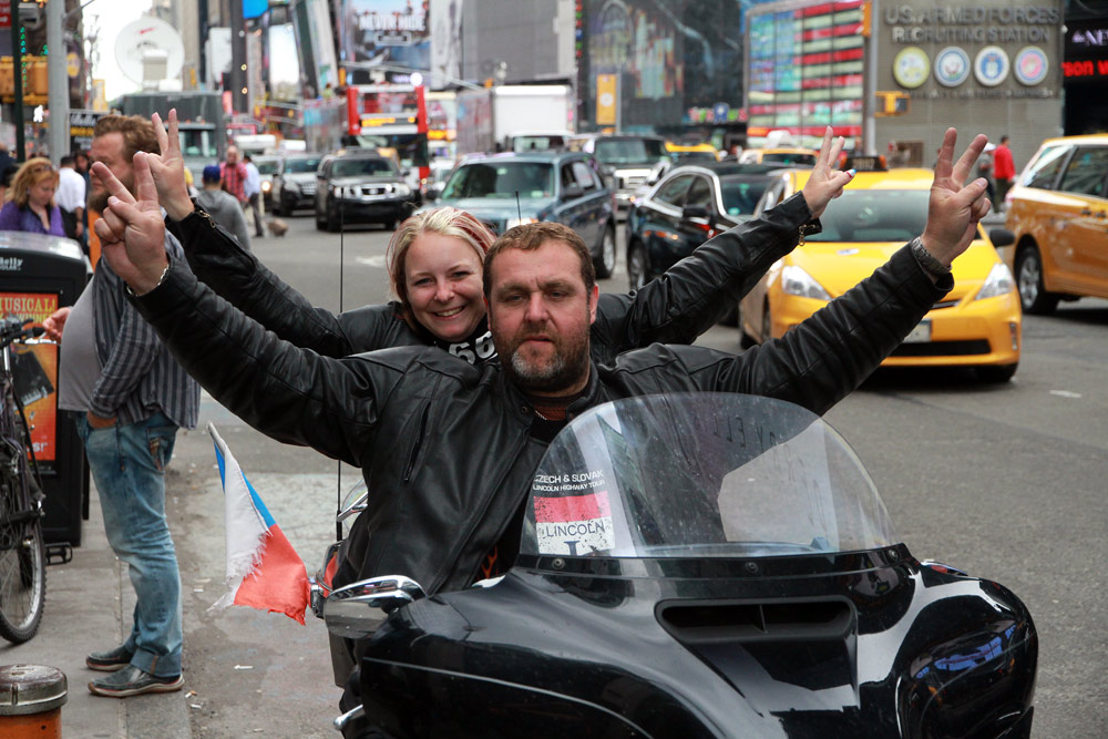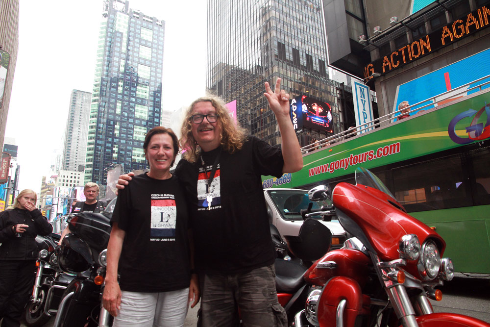 I když průjezd New Yorku nebývá zrovna snadnou záležitostí, dnes šlo vše relativně hladce. Dokonce jsme na Times Square našli i vhodné místo k zaparkování našich vozidel a mohli se dostatečně věnovat pózování před kamerami a fotoaparáty. A zřejmě jsme na tom velkém „rynku“ působili tak exotickým dojmem, že nás kolemjdoucí newyorčané žádali o společné snímky, až jsme skoro začali přemýšlet o tom, že bychom se touto činností mohli docela slušně živit :).