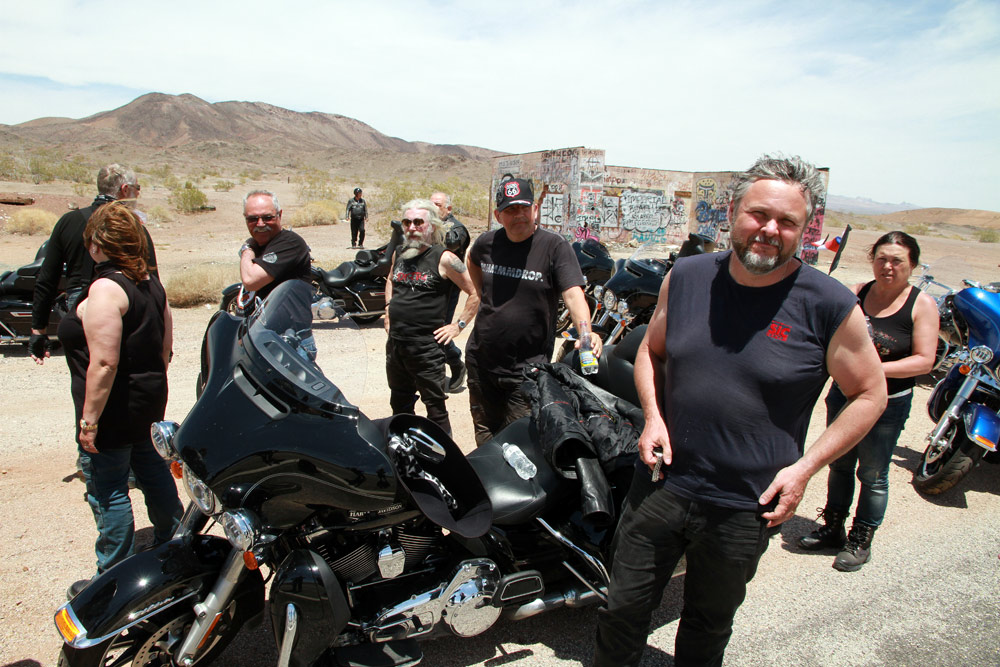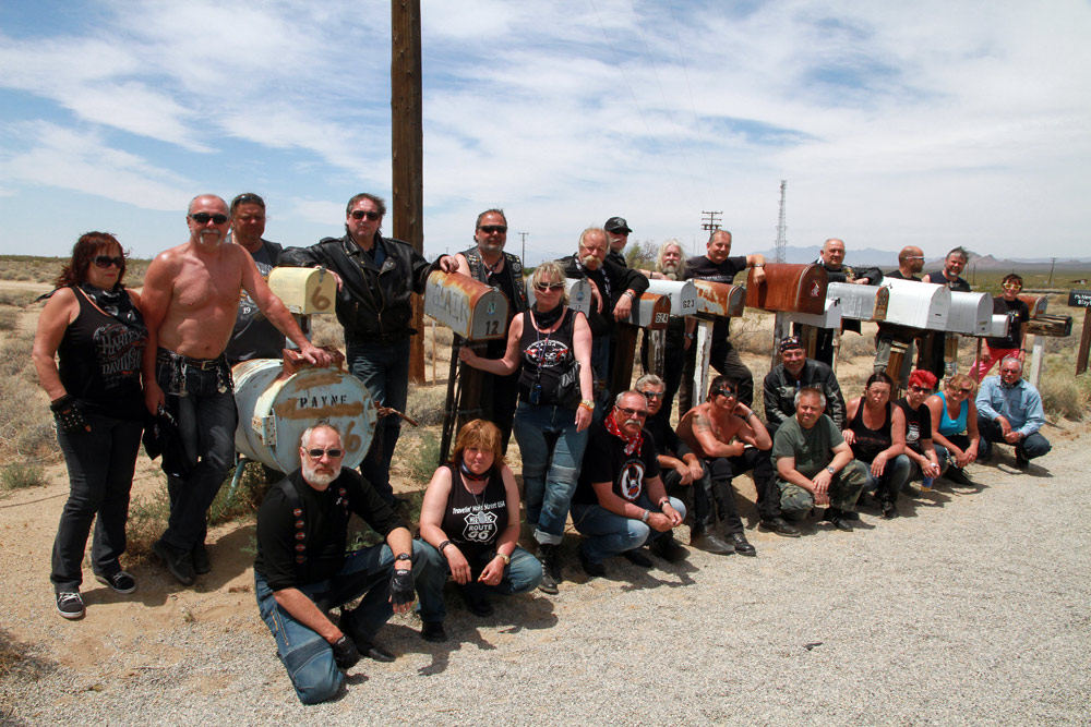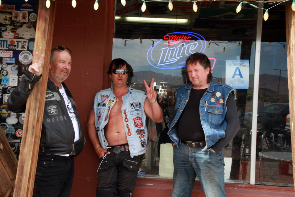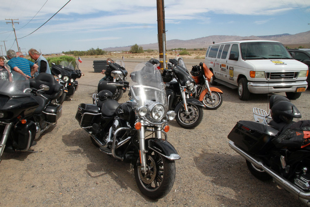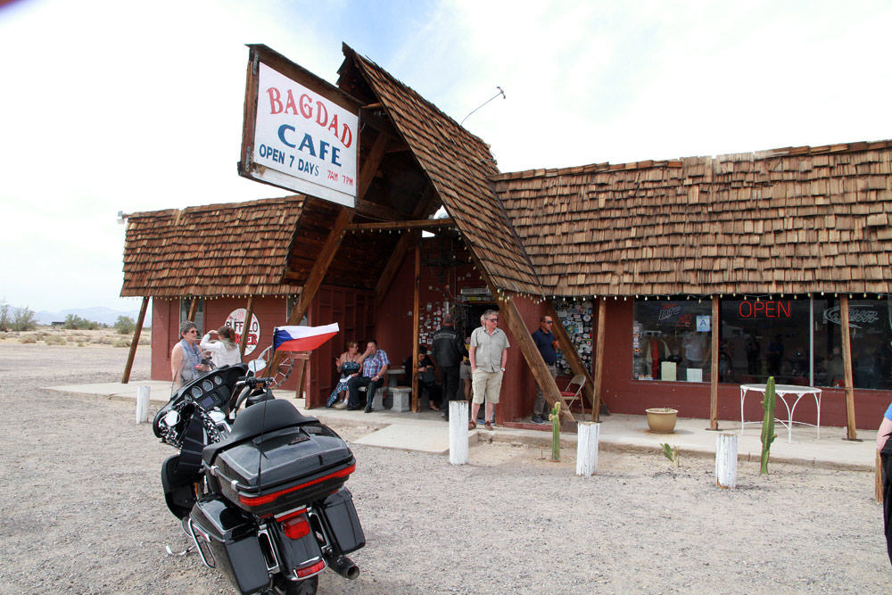 Z Las Vegas jsme se opět připojili na Route 66 a nastoupili cestu skrze poušť Mojave. Kromě horka, které však bylo v rámci pouštních norem snesitelné, nás dnes provázel silný vítr, a ten moc příjemný nebyl. Ale tradiční zastávky v Amboy a v Bagdad Cafe na sto procent splnily svůj účel. Jen kdyby malý prostor filmového Bagdadu zrovna neokupovaly dva autobusy plné francouzských turistů. Avšak díky této skutečnosti se všech šestnáct motocyklů (a motorkářů) naší výpravy stalo centrem pozornosti pařížských důchodkyň a jejich fotoaparátů :)