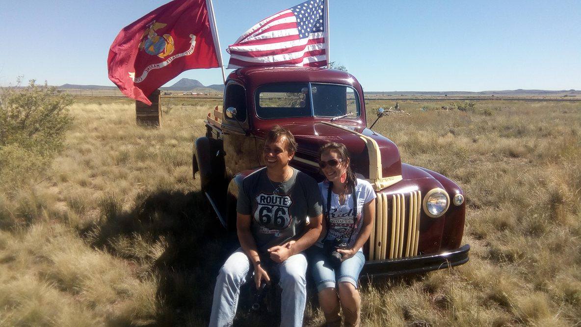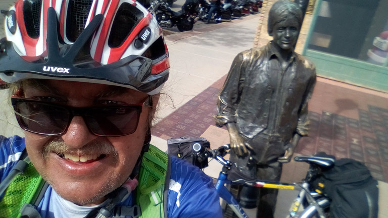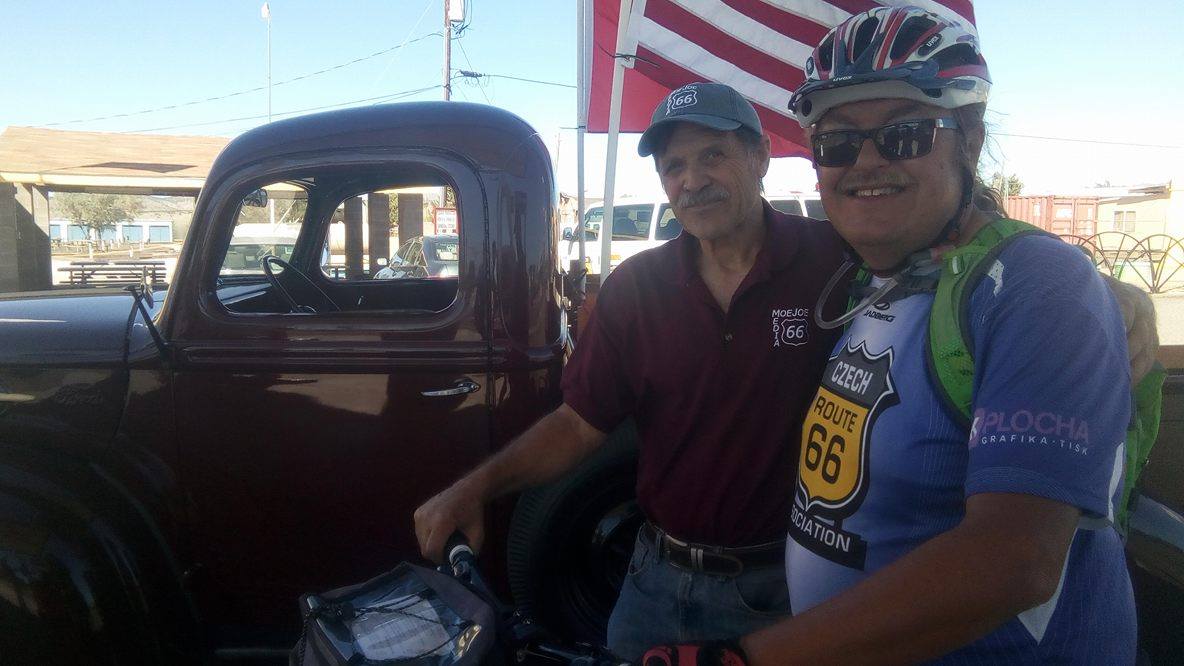 Před Seligmanem na mě čekal můj přítel Frank Kocevar se svojí ženou Lynne, aby mě do města doprovázeli v krásném historickém autě (fanoušci amerik jistě okamžitě definují značku, model, rok výroby i počet vyrobených kusů ) a v Seligmanu samotném se ke mně na krátkou společnou cyklistickou vyjížďku přidal sám slavný holič Angel Delgadillo! Byla to pro mě velká čest.