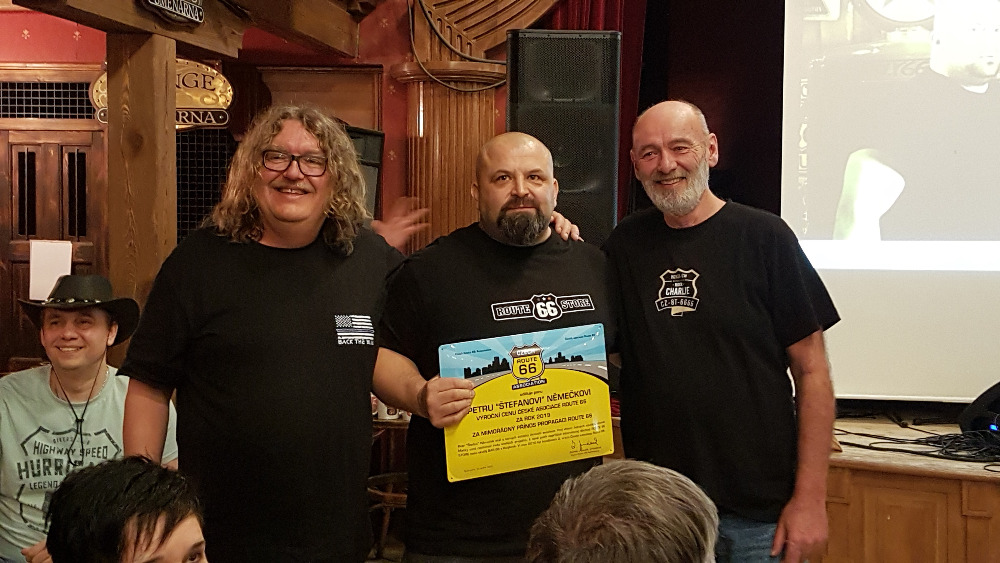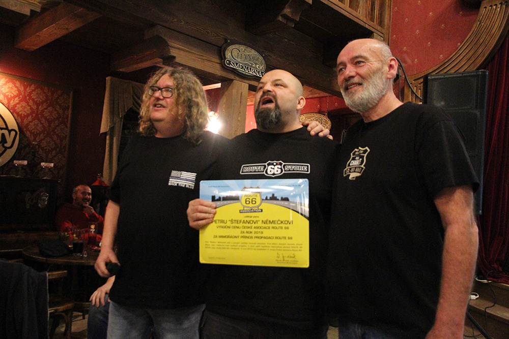 A co Cena České asociace Route 66 za rok 2019? Kdo se stal jejím držitelem? Zde je odpověď: za mnohaleté zásluhy o propagaci Route 66 si cenu plně zasloužil Petr „Štefan“ Němeček, jeden z prvních členů asociace, majitel úžasného Baru 66 v Holýšově či zakladatel internetového obchodu Route66store.cz. Ocenění je opravdu v těch pravých rukou!